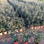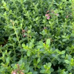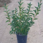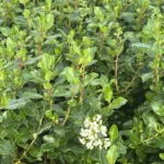 Arbusto con flores blancas y follaje brillante, resistente a la sequía, perfecto para setos en jardines soleados.